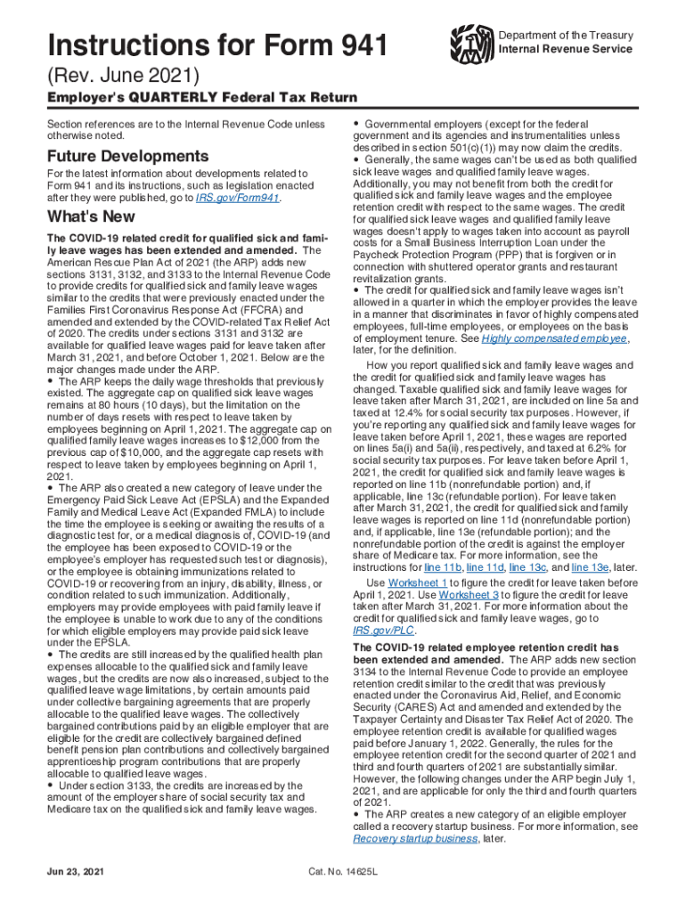 Instructions for Form 941Department of the Treasury Internal Revenue Service×Rev. June 2021×Employer\'s QUARTERLY Federal Tax Return Section references are to the Internal Revenue Code unless otherwise
