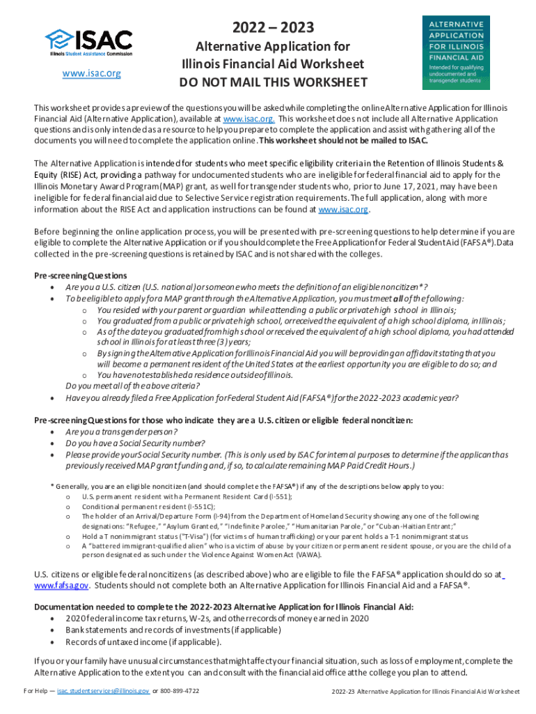 2022 2023 www.isac.orgAlternative Application for Illinois Financial Aid Worksheet DO NOT MAIL These Worksheets' worksheet provides a preview of the questions you will be asked while completing the