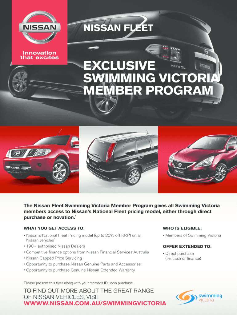 NISSAN FLEETEXCLUSIVE SWIMMING VICTORIA MEMBER Program Nissan Fleet Swimming Victoria Member Program gives all Swimming Victoria members access to Nissan's National Fleet pricing model, either through