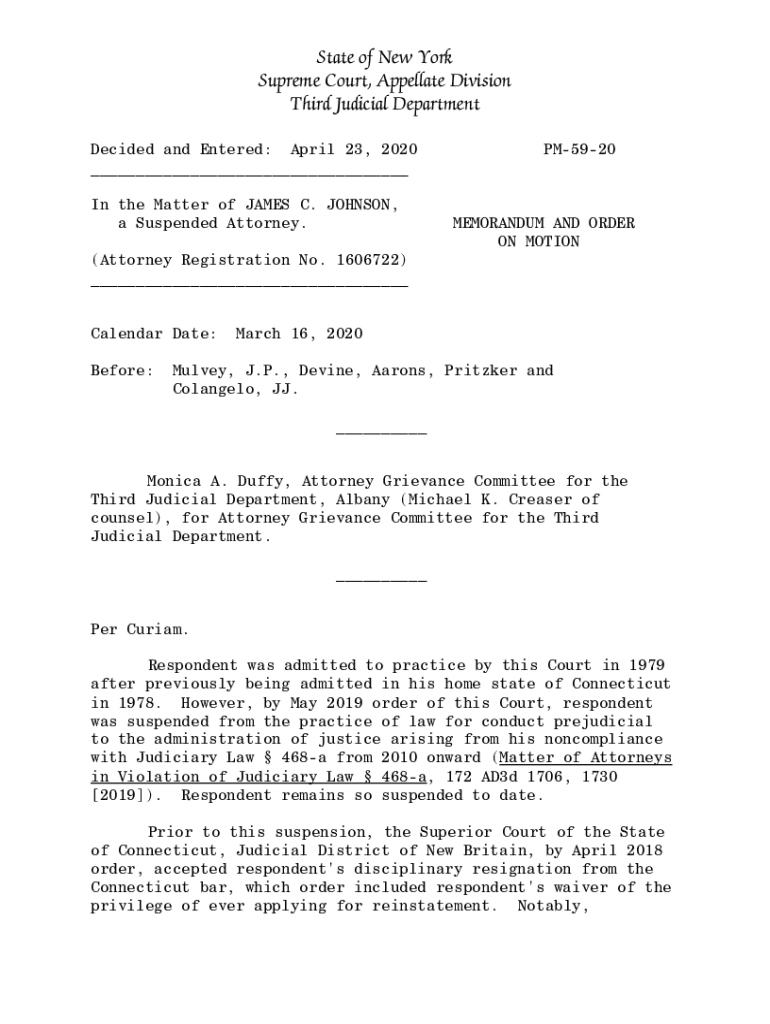 State of New York Supreme Court, Appellate Division Third Judicial Department Decided and Entered: April 23, 2020 ___ In the Matter of JAMES C. JOHNSON, a Suspended Attorney. (Attorney Registration