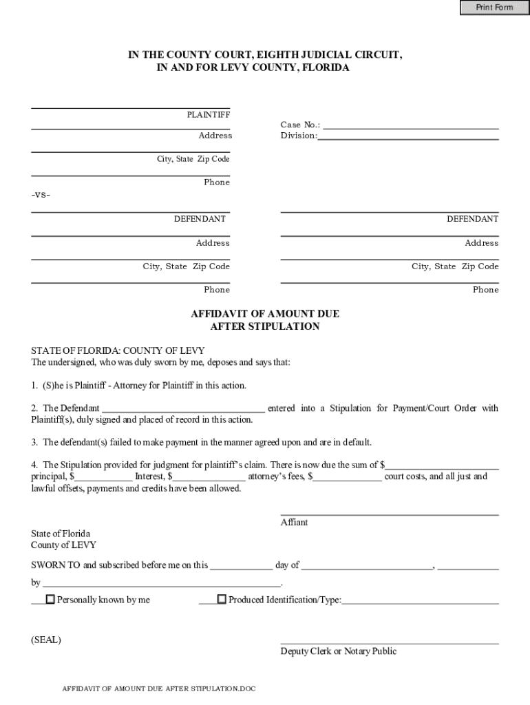 Print Forming THE COUNTY COURT, EIGHTH JUDICIAL CIRCUIT, IN AND FOR LEVY COUNTY, FLORIDAPLAINTIFF Address Case No.: Division:City, State Zip Code PhonevsDEFENDANTDEFENDANTAddressAddressCity, State
