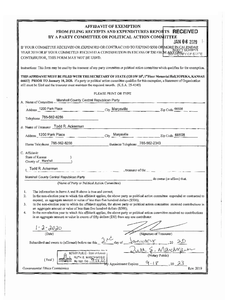 AFFIDAVIT OF EXEMPTION FROM FILING RECEIPTS AND EXPENDITURES REPO ITS RECEIVED BY A PARTY COMMITTEE OR POLITICAL ACTION Committee. JAN 0 6 2020!.IF YOUR Committee RECEIVED OR EXPENDED OR CONTRACTED