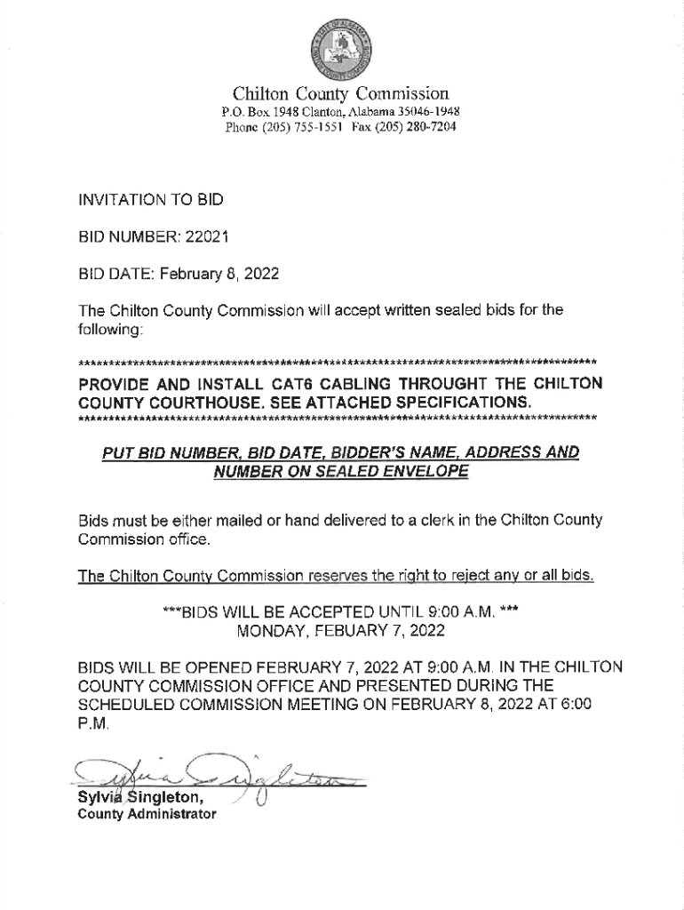 BID# 22021 Courthouse Cabling 20212022Invitation to Bid Chilton County is seeking bids to provide and install Cat6 Cabling throughout the Chilton County Courthouse, located at 500 2nd Ave. N, Clinton,