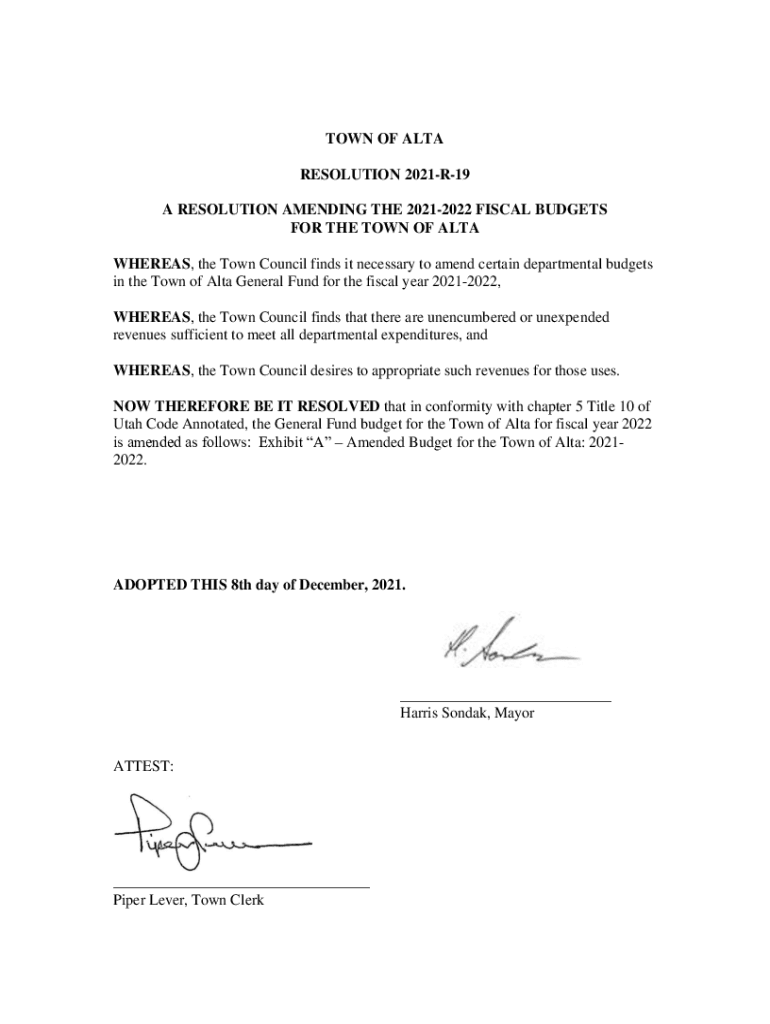 TOWN OF ALTA RESOLUTION 2021R19 A RESOLUTION AMENDING THE 20212022 FISCAL BUDGETS FOR THE TOWN OF ALTA WHEREAS, the Town Council finds it necessary to amend certain departmental budgets in the Town