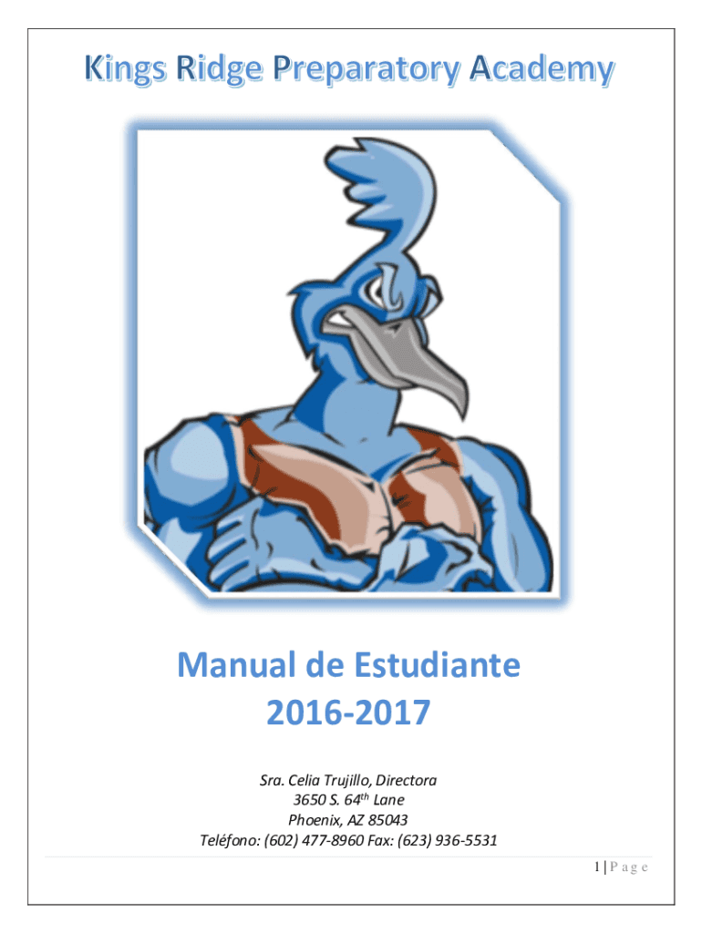 Manual de Estudiante 20162017 SRA. Celia Trujillo, Director 3650 S. 64th Lane Phoenix, AZ 85043 Teflon: (602) 4778960 Fax: (623) 9365531 1|Page Kings Ridge Preparatory Academy Manual del Estudiante