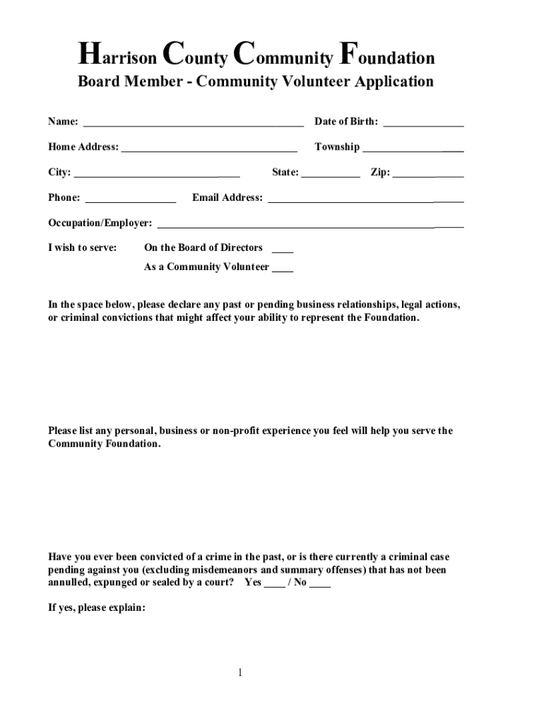 Harrison County Community Foundation Board Member Community Volunteer ApplicationName: ___Date of Birth: ___Home Address: ___Township ___City: ___ Phone: ___State: ___Zip: ___Email Address: ___Occupation/Employer: