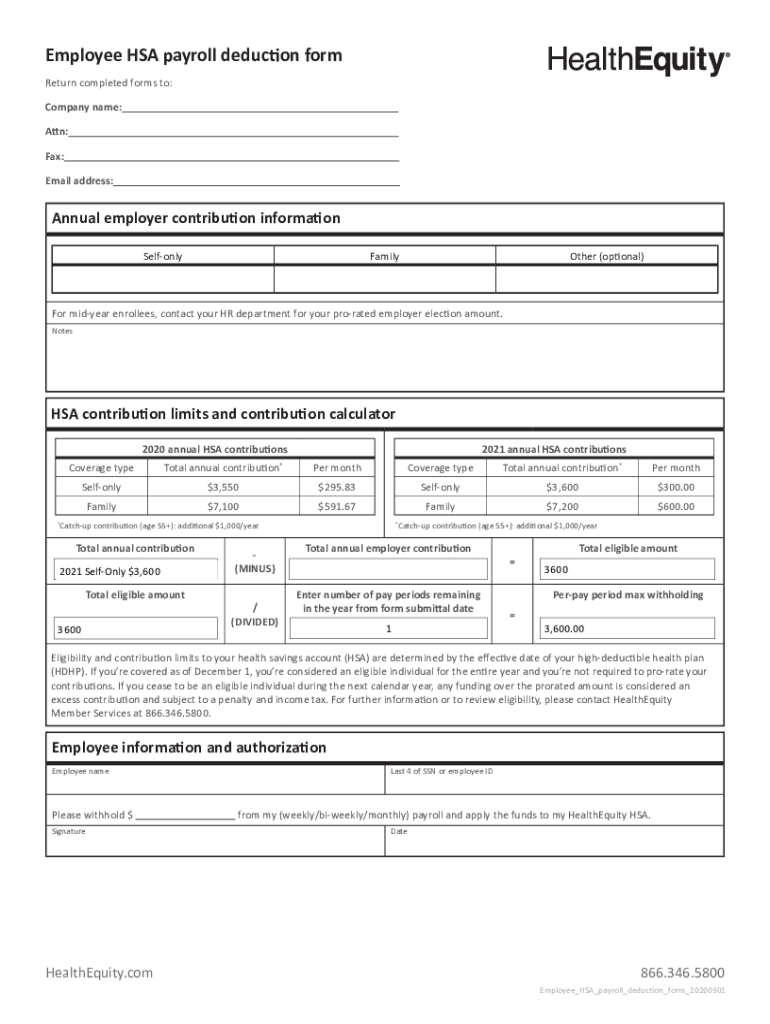 Employee HSA payroll deduction form Return completed forms to: Company name: Attn: Fax: Email address:Annual employer contribution information SelfonlyFamilyOther (optional×For midyear enrolled,