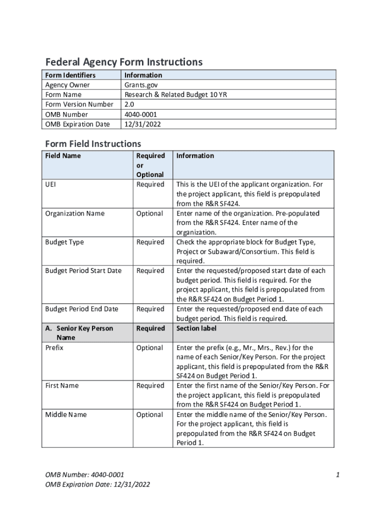 Federal Agency Form Instructions Form Identifiers Agency Owner Form Name Form Version Number OMB Expiration Disinformation Grants.gov Research & Related Budget 10 YR 2.0 40400001 12×31/2022Form Field