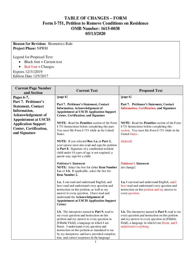 TABLE OF CHANGES FORM I751, Petition to Remove Conditions on Residence OMB Number: 16150038 05×13/2020 Reason for Revision: Biometrics Rule Project Phase: NORM Legend for Proposed Text: Black font