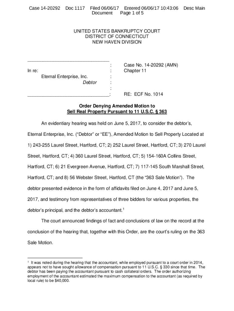 Case 1420292Doc 1117Filed 06×06/17 Entered 06×06/17 10:43:06 Document Page 1 of 5Desc Maintained STATES BANKRUPTCY COURT DISTRICT OF CONNECTICUT NEW HAVEN DIVISION___ : In re: : Eternal Enterprise,