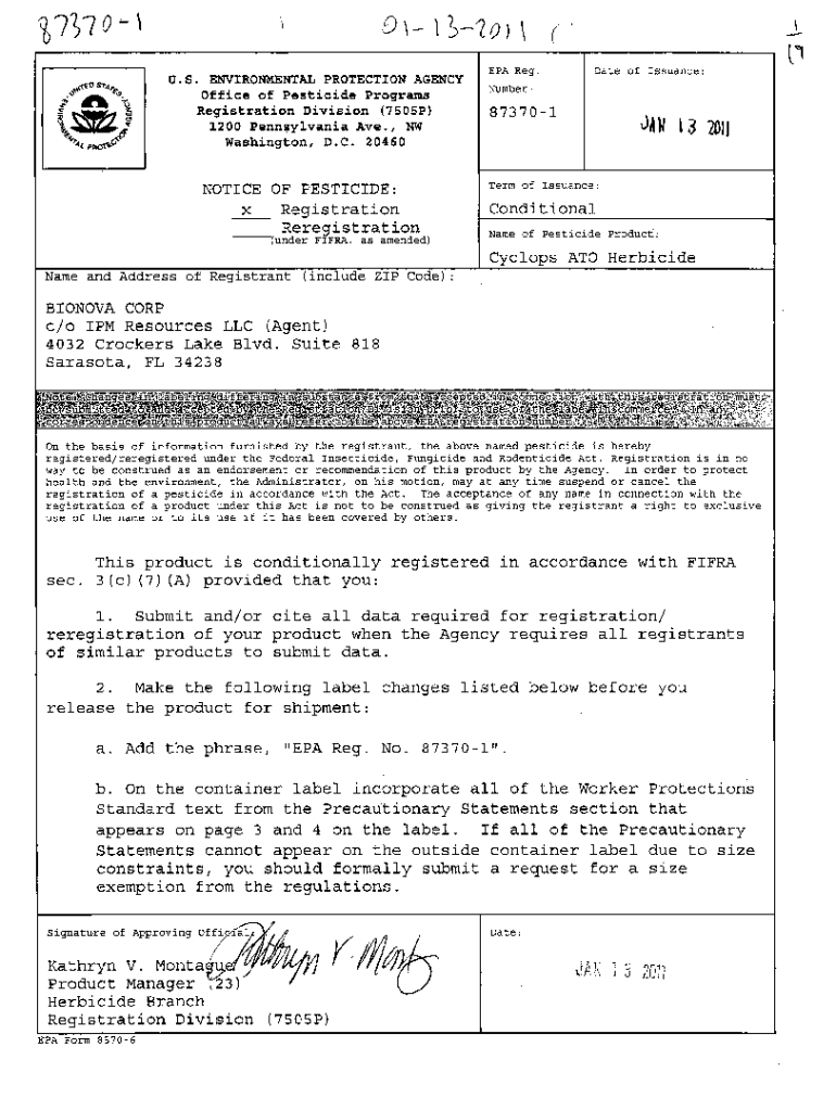 , c U.S. ENVIRONMENTAL PROTECTION AGENCY Office of Pesticide Programs Registration Division (7505P× 1200 Pennsylvania Ave., NW Washington, D.C. 20460NOTICE OF PESTICIDE: X Registration Preregistration×under