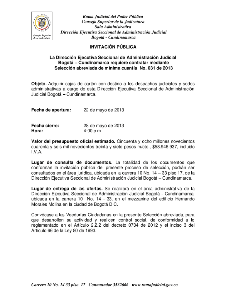 Rama Judicial Del Power Public Consent Superior de la Judicature Sale Administrative Direction Executive Sectional de Administracin Judicial Boot Cundinamarca INVITATION PBL ICA La Direction Executive