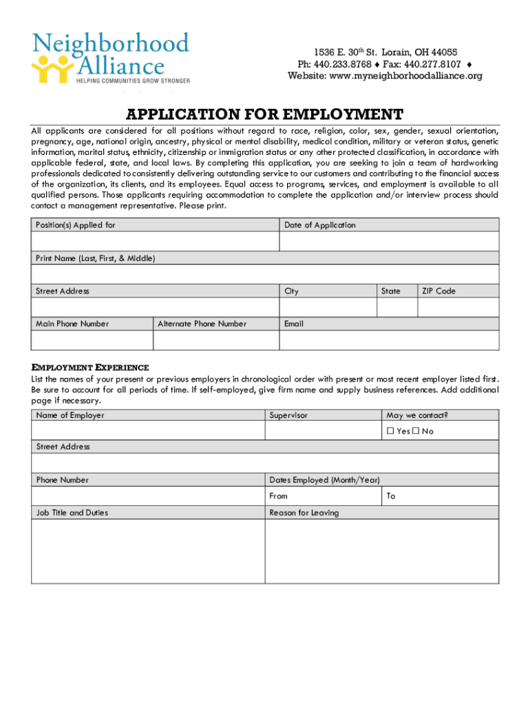 1536 E. 30th St. Lorain, OH 44055 pH: 440.233.8768 Fax: 440.277.8107 Website: www.myneighborhoodalliance.orgAPPLICATION FOR EMPLOYMENT All applicants are considered for all positions without regard