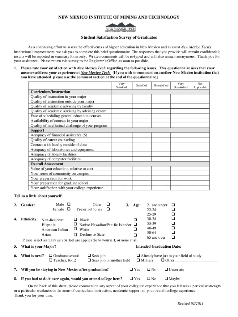 NEW MEXICO INSTITUTE OF MINING AND TECHNOLOGYStudent Satisfaction Survey of Graduates As a continuing effort to assess the effectiveness of higher education in New Mexico and to assist New Mexico