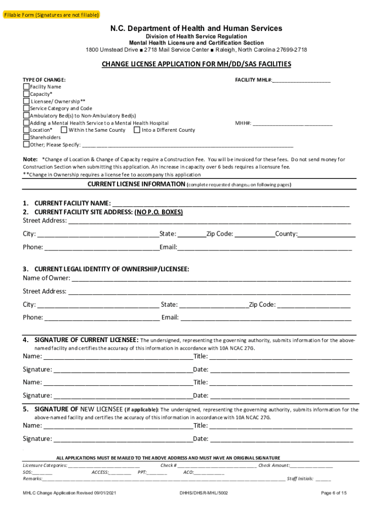 North Carolina Department of Health and Human Services Division of Health Service Regulation Mental Health Licensure & Certification SectionChange Licensure Application Packet Form# HHS×DSR×MHL5002