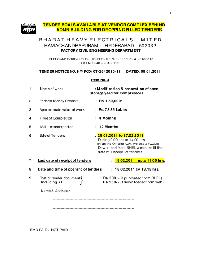 1TENDER BOX IS AVAILABLE AT VENDOR COMPLEX BEHIND ADEN BUILDING FOR DROPPING FILLED TENDERS.BHARAT HEAVY ELECTRICAL LIMITED RAMACHANDRAPURAM : : HYDERABAD 502032 FACTORY CIVIL ENGINEERING DEPARTMENT