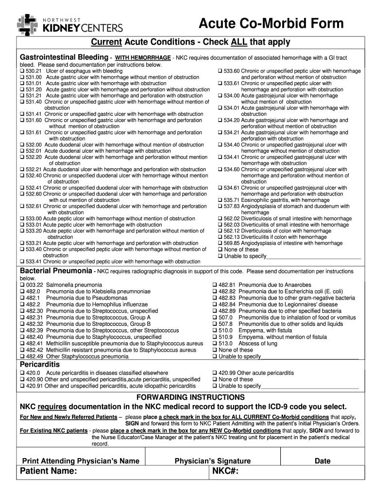 The Acute Co-Morbid Form is a medical record release document used by healthcare providers to communicate a patient's acute conditions to NKC.