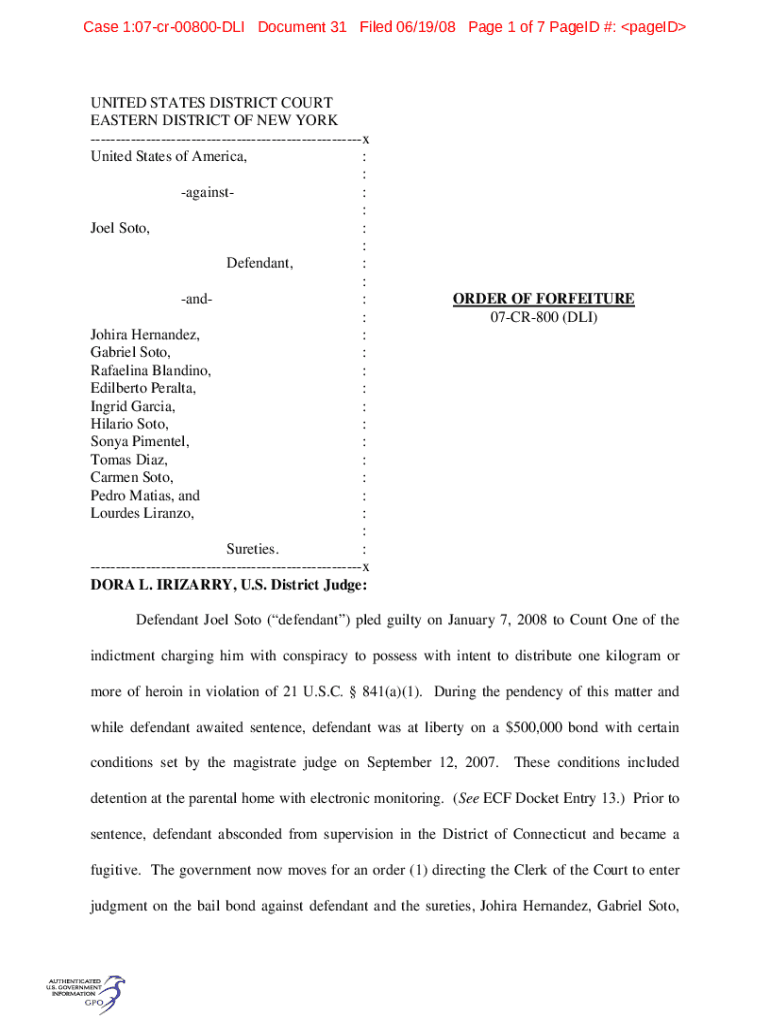 Get the free U.S. v. Soto, 07-cr-800, order declaring bail forfeited.docx