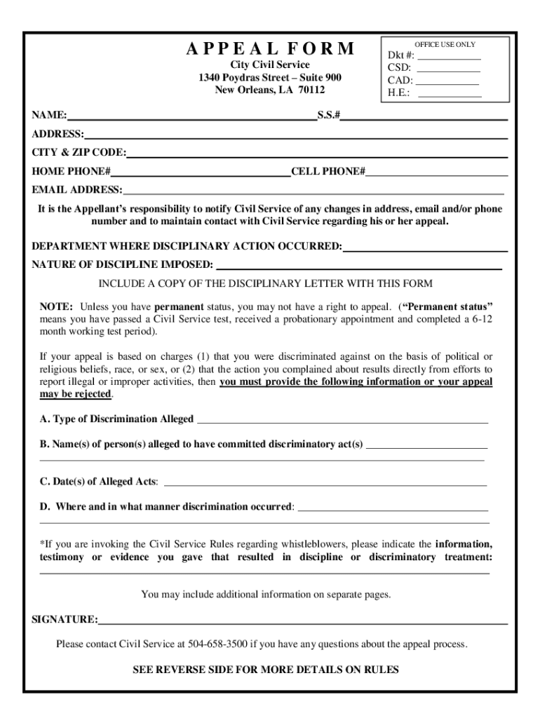 APPEAL FORM City Civil Service 1340 Hydras Street Suite 900 New Orleans, LA 70112 NAME:OFFICE USE Only #: ___ CSD: ___ CAD: ___ H.E.: ___S. S.×ADDRESS: CITY & ZIP CODE: HOME PHONE×CELL PHONE#___EMAIL