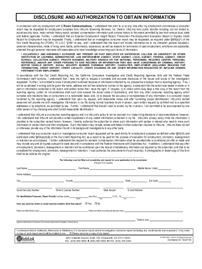 DISCLOSURE AND AUTHORIZATION TO OBTAIN INFORMATION Sin connection with my employment with 3 Rivers Communications, I understand that prior to or at any time after my employment commences a consumer