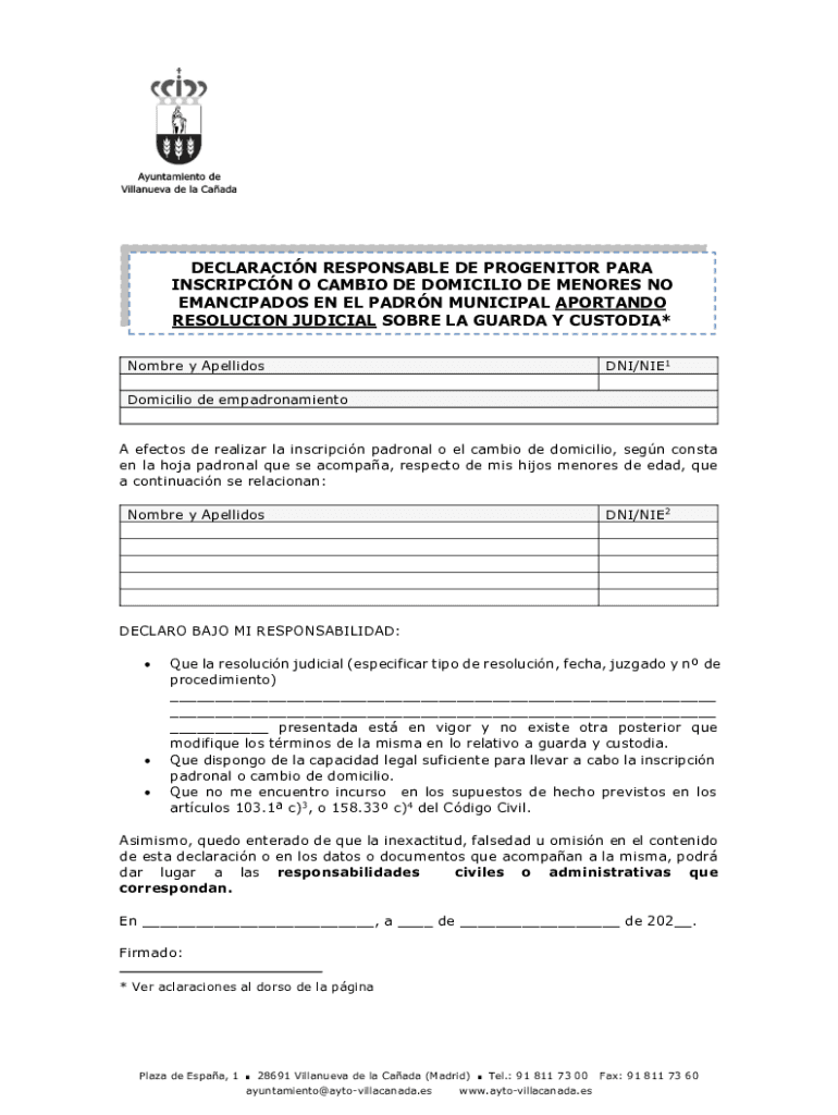 DECLARATION RESPONSIBLE DE PROGENITOR PARA INSCRIPTION O CAM BIO DE DOMICILE DE SEÑORES NO EMANCIPATOR EN EL PADRE MUNICIPAL PORTLAND RESOLUTION JUDICIAL SORE LA GUARD Y CUSTODIAL* Hombre y ApellidosDNI×NIE1Domicilio