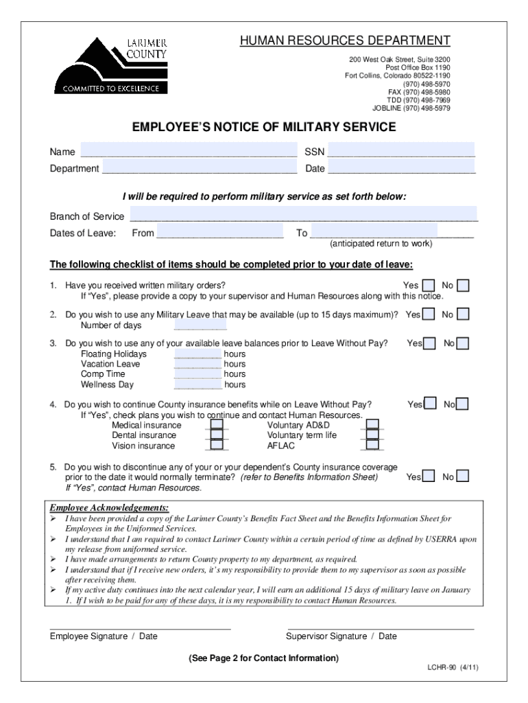 Get the free EMPLOYEE'S NOTICE OF MILITARY SERVICE - Larimer ...