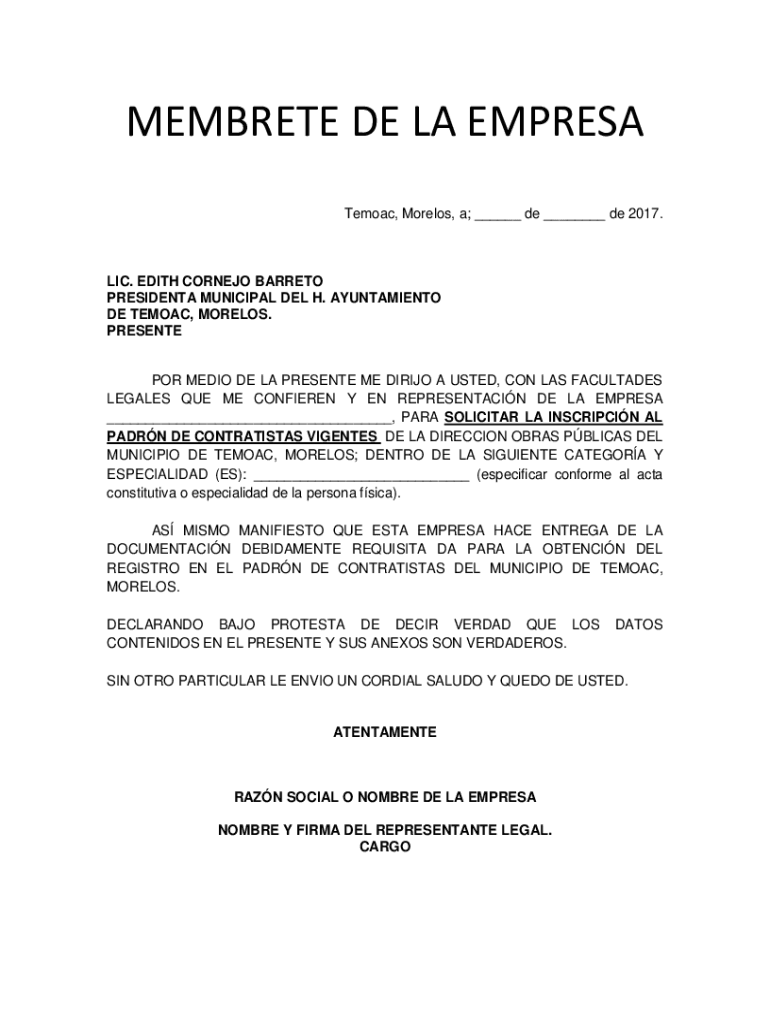 MEMBRANE DE LA EMPRESS Bemoan, Morelos, a; ___ DE ___ DE 2017.LIC. EDITH CORNER BARRETT PRESIDENT MUNICIPAL DEL H. AYUNTAMIENTO DE BEMOAN, MORELOS. PRESENTER MEDIA DE LA PRESENT ME DARIO A USED, CON