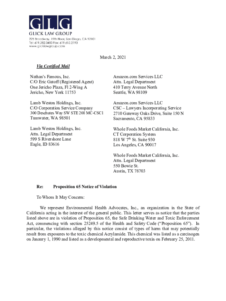 March 2, 2021, Via Certified Mail Nathan\'s Famous, Inc. C×O Eric Ga toff (Registered Agent) One Jericho Plaza, Fl 2Wing A Jericho, New York 11753Amazon.com Services LLC Attn. Legal Department 410