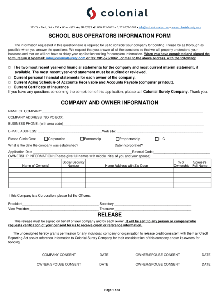 123 Time Blvd., Suite 250 Wood cliff Lake, NJ 07677 P: 8002213662 F: 2015731062 info×colonialsurety.com www.colonialsurety.comSCHOOL BUS OPERATORS INFORMATION FORM The information requested in this