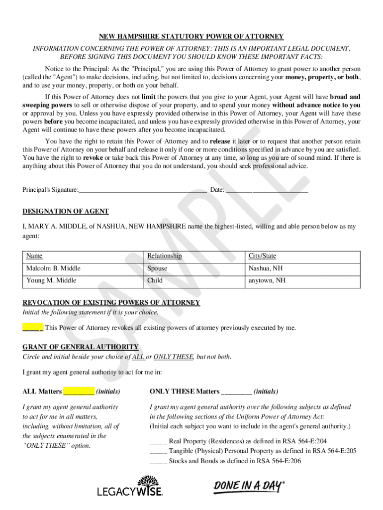 NEW HAMPSHIRE STATUTORY POWER OF ATTORNEY INFORMATION CONCERNING THE POWER OF ATTORNEY: THIS IS AN IMPORTANT LEGAL DOCUMENT. BEFORE SIGNING THIS DOCUMENT YOU SHOULD KNOW THESE IMPORTANT FACTS: Notice