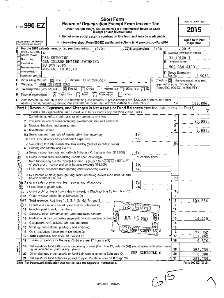 Short Form Form990EZDepartment of the Treasury Internal Revenue Service Check if applicable Address change Finale change n Initial return FIFinalreturn/ terminated Amendedreturn2015Under section 501×c),