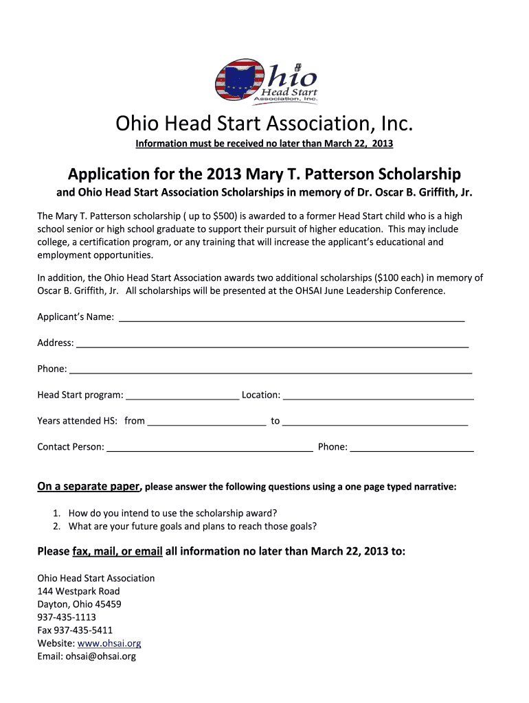 Ohio Head Start Association, Inc. Information must be received no later than March 22, 2013, Application for the 2013 Mary T. Patterson Scholarship and Ohio Head Start Association Scholarships in