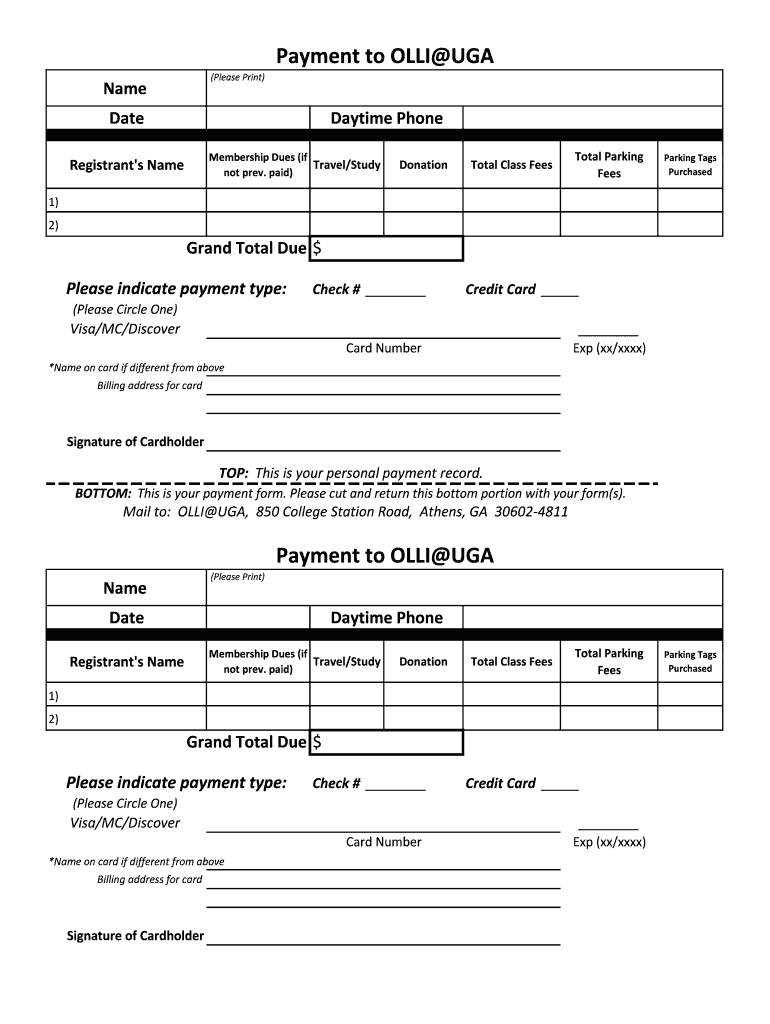 Payment to OLLIE UGA (Please Print) Name Date Daytime Phone Membership Dues (if Travel/Study not prey. Paid) Registrant's Name Donation Total Class Fees Total Parking Fees Parking Tags Purchased 1)