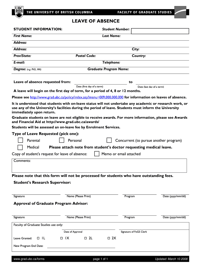 LEAVE OF ABSENCE STUDENT INFORMATION: Student Number: First Name: Last Name: Address: Address: City: Prov/State: Postal Code: E-mail: Country: Telephone: Degree: (e.g. PhD, MA) Graduate Program Name: