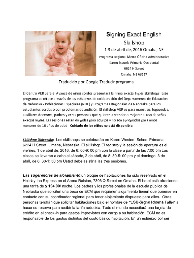 Signing Ex act English Skill shop 13deabrilde,2016Omaha,NE ProgramaRegionalMetroOficinaAdministrativa KarenEscuelaPrimariaOccidental 6624HStreetOmaha,NE68117TraducidoporGoogleTraducirprograma. ElCentroVERparaelAvancedeniossordospresentarlafirmaexactaInglsSkillshops.