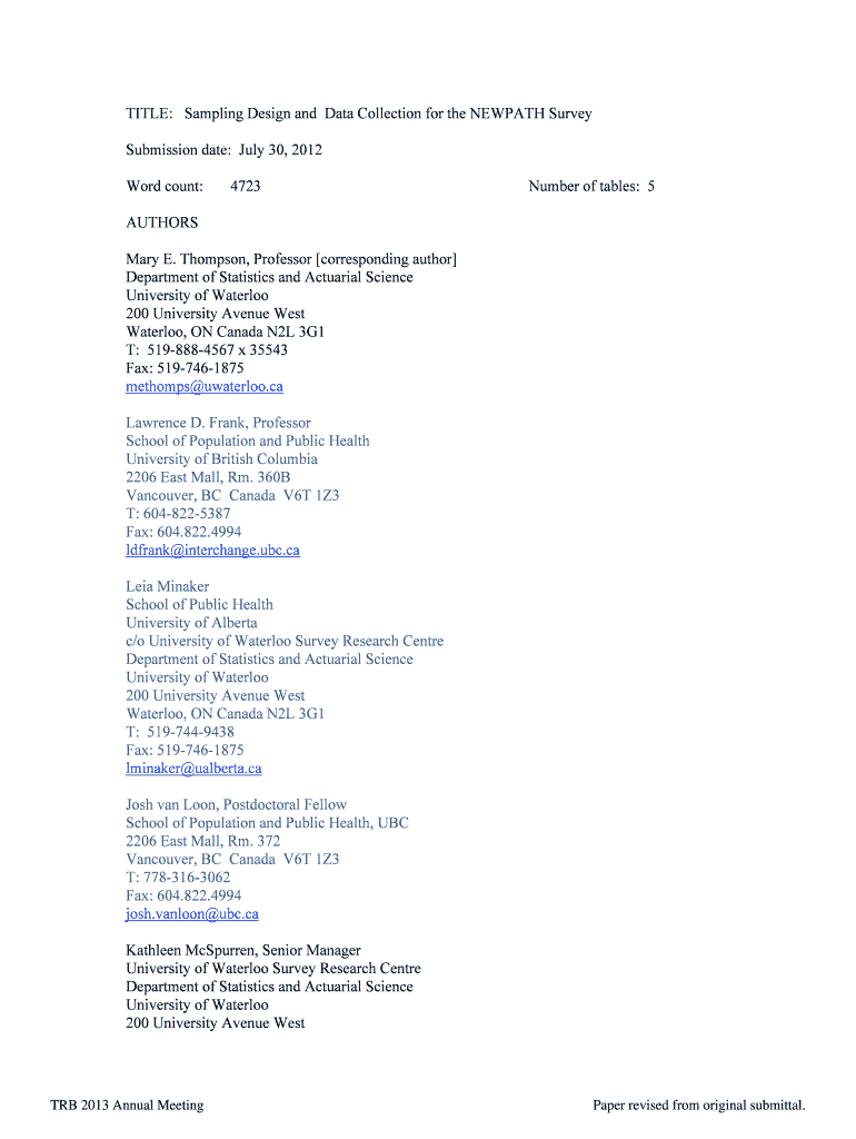 TITLE: Sampling Design and Data Collection for the TOWPATH Survey Submission date: July 30, 2012, Word count: 4723 Number of tables: 5 AUTHORS Mary E. Thompson, Professor corresponding author Department