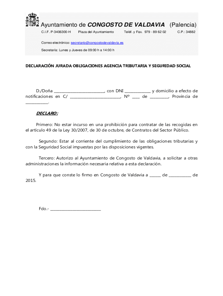 Ayuntamiento de CONGOSTO DE MOLDAVIA (Valencia) C.I.F. P3406300HPlaza del AyuntamientoTelf. Y Fax. 979 89 62 02C. P.: 34882Correo electric: secretario@congostodevaldavia.es Secretary: Lines y Jeeves