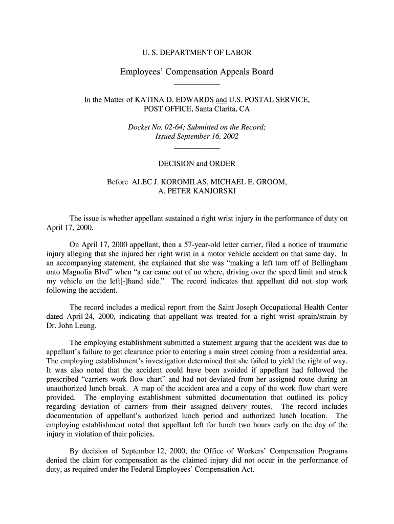 This document outlines the decision regarding the appeal made by Katina D. Edwards concerning a right wrist injury sustained during the performance of duty as a letter carrier for the U.S. Postal