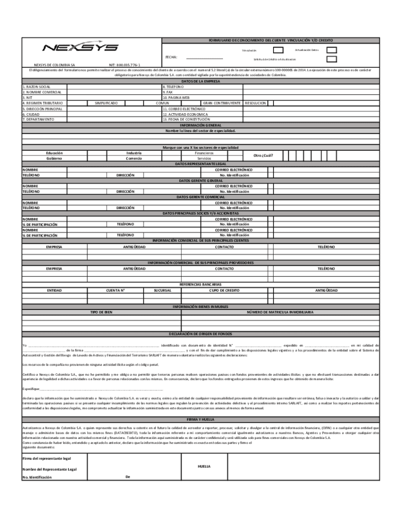 FORMULA RIO DE CONOCIMIENTO DEL CLIENT VINCULACIN Y/O CREDIT VinculacinFECHA: NESTS DE COLOMBIA SA___Actualizacin DatosSolicitud de Crdito o ActualizacionNIT: 800.035.7761El diligenciamiento Del formulation