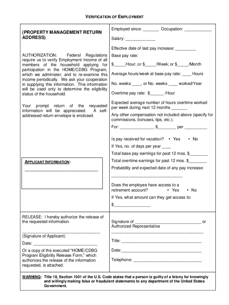 VERIFICATION OF EMPLOYMENT (PROPERTY MANAGEMENT RETURN ADDRESS)Employed since: ___ Occupation: ___ Salary: ___ Effective date of last pay increase: ___AUTHORIZATION: Federal Regulations require us