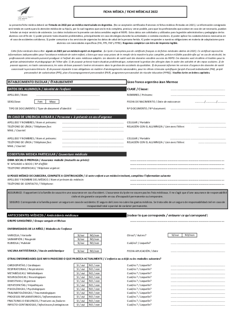 FICA MICA / FICHE MEDICAL 2022La present fiche mica deer SER Narmada en 2022 PO Run medico matriculate en Argentina. (No SE certain certificates Frances NI fiches medical armadas' en 2021). La information