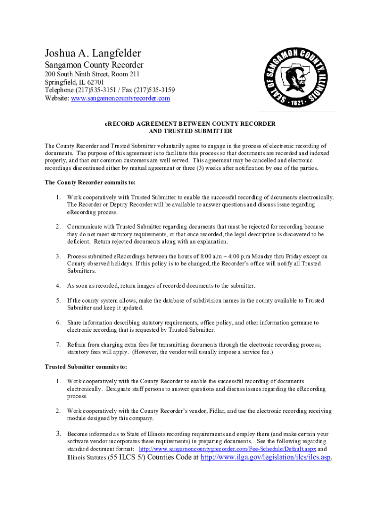 Joshua A. Landholder Salmon County Recorder 200 South Ninth Street, Room 211 Springfield, IL 62701 Telephone (217)5353151 / Fax (217)5353159 Website: www.sangamoncountyrecorder.comeRECORD AGREEMENT