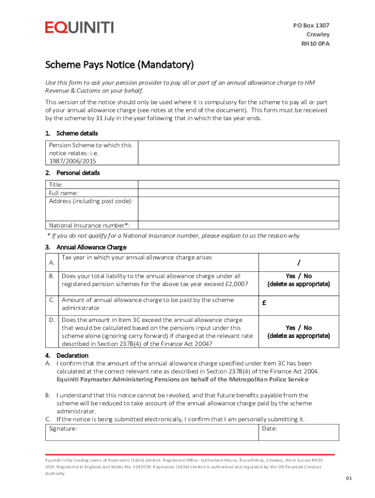 PO Box 1307 Crawley RH10 0PAScheme Pays Notice (Mandatory) Use this form to ask your pension provider to pay all or part of an annual allowance charge to HM Revenue & Customs on your behalf. This
