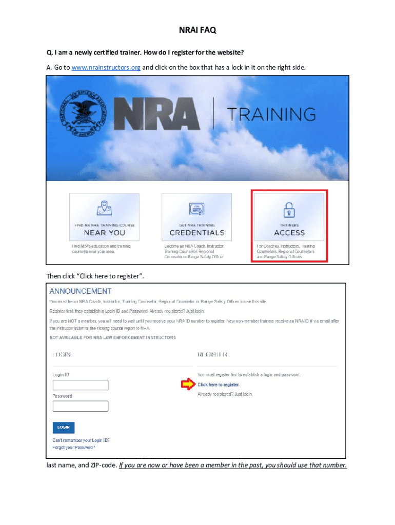 NRA FAQ Q. I am a newly certified trainer. How do I register for the website? A. Go to www.nrainstructors.org and click on the box that has a lock in it on the right side. Then click here to register.