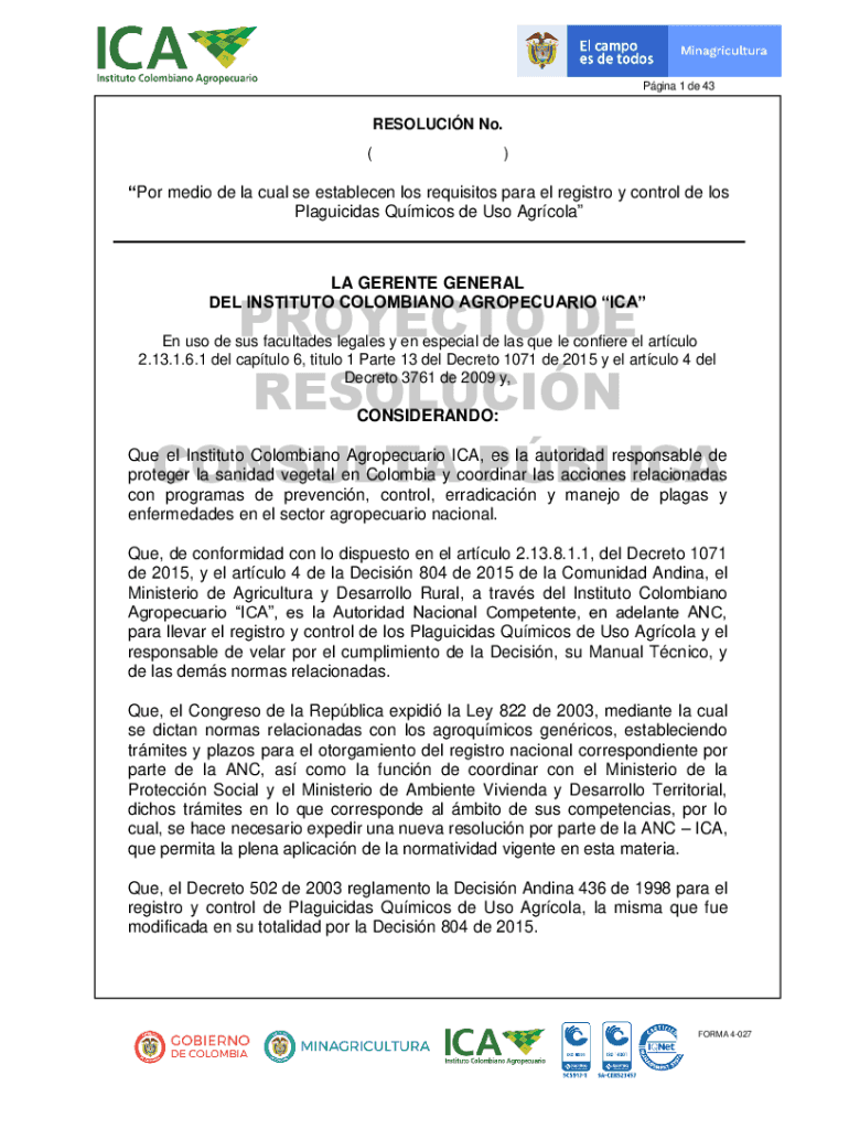 Gina 1 de 43RESOLUCIN No. ()POR media DE la coal SE stablemen Los requisites para El registry y control de Los Plaguicidas Pumices de Uso Agricola TERENCE GENERAL DEL INSTITUTE COLOMBIAN AGROPECUARIO