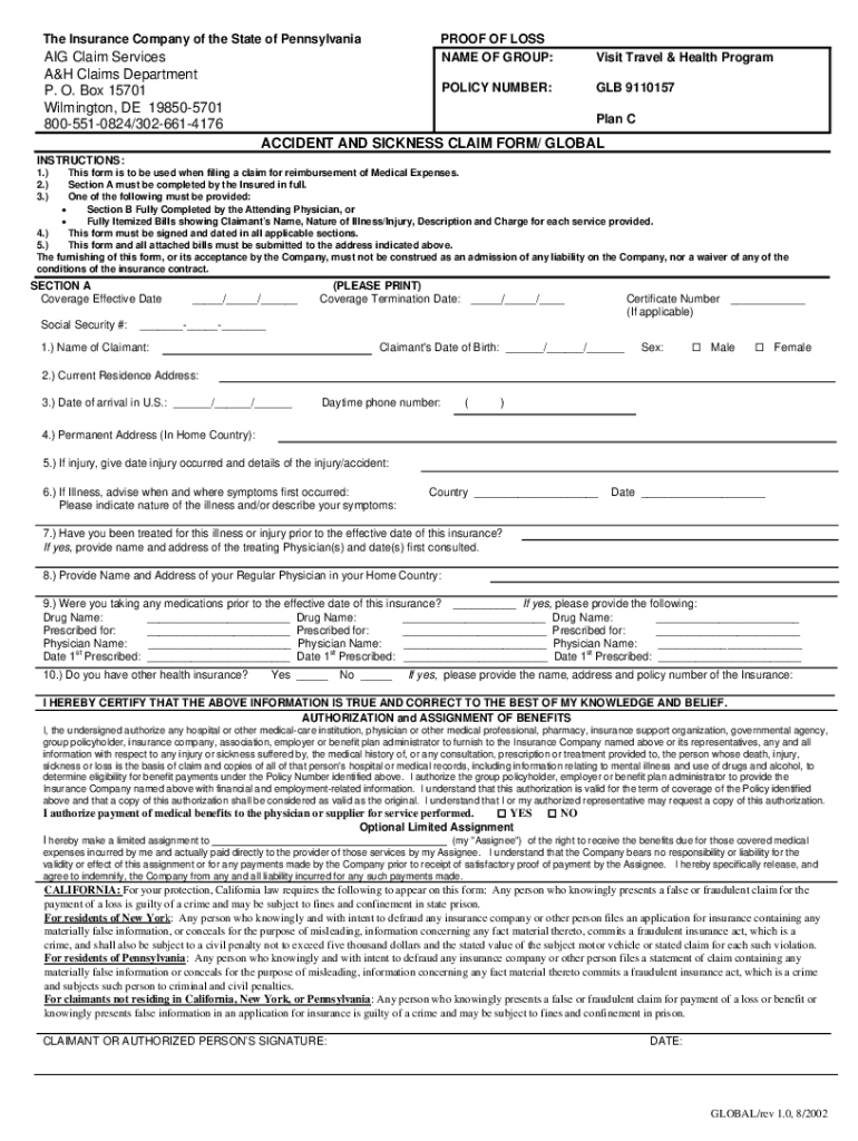 The Insurance Company of the State of Pennsylvania AIG Claim Services A&H Claims Department P. O. Box 15701 Wilmington, DE 198505701 8005510824×3026614176PROOF OF LOSS NAME OF GROUP:Visit Travel