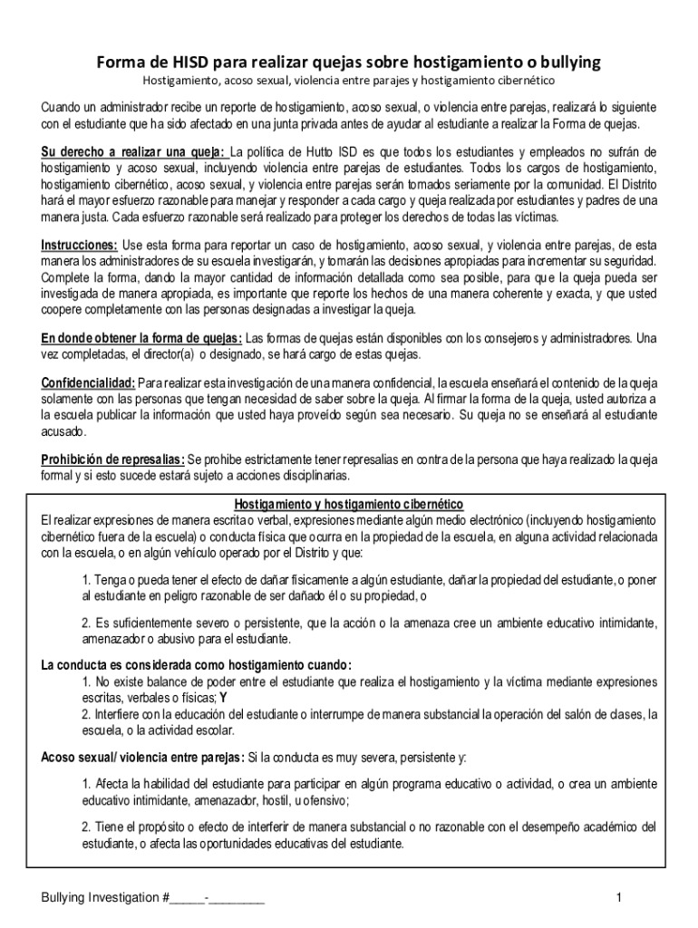 Form de HISD para realizer Queens sober hostigamiento o bullying Hostigamiento, across sexual, violence entire parades y hostigamiento cibernticoCuando UN administrator recipe UN report de hostigamiento,