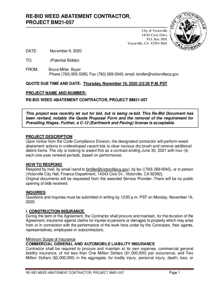REBID WEED ABATEMENT CONTRACTOR, PROJECT BM21057 City of Victorville 14343 Civic Drive P.O. Box 5001 Victorville, CA 923935001DATE:November 9, 2020TO:(Potential Bidder×FROM:Bruce Miller, Buyer Phone