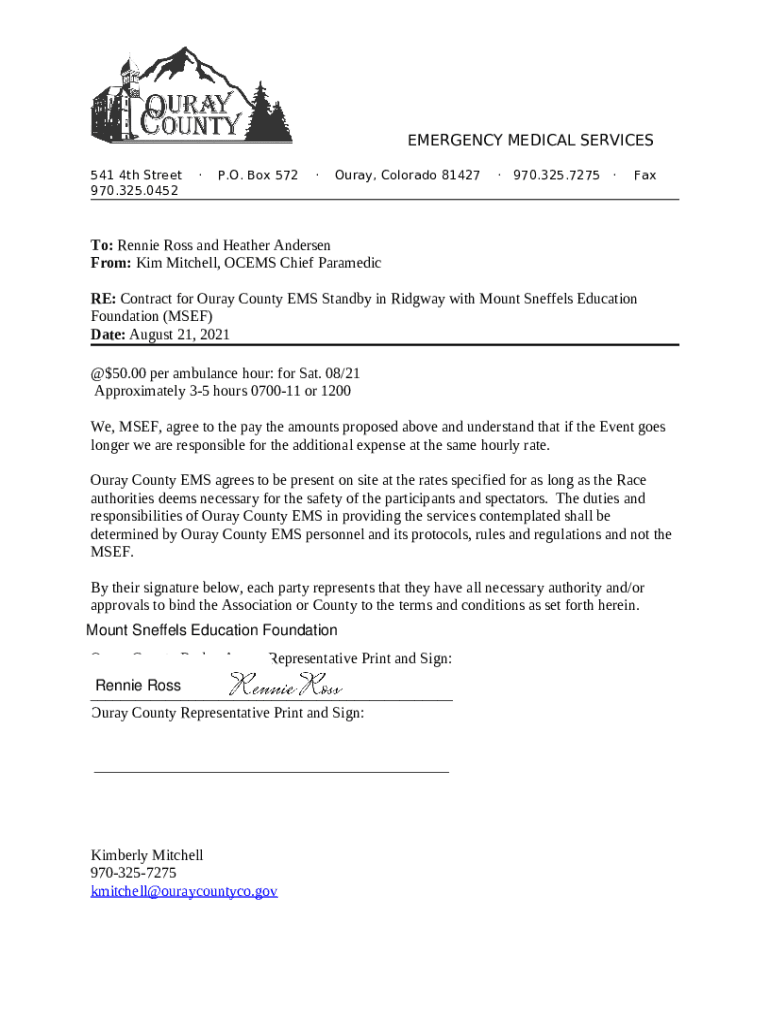 EMERGENCY MEDICAL SERVICES 541 4th Street 970.325.0452P. O. Box 572Ouray, Colorado 81427 970.325.7275 Fact: Ronnie Ross and Heather Andersen From: Kim Mitchell, CEMS Chief Paramedic RE: Contract for