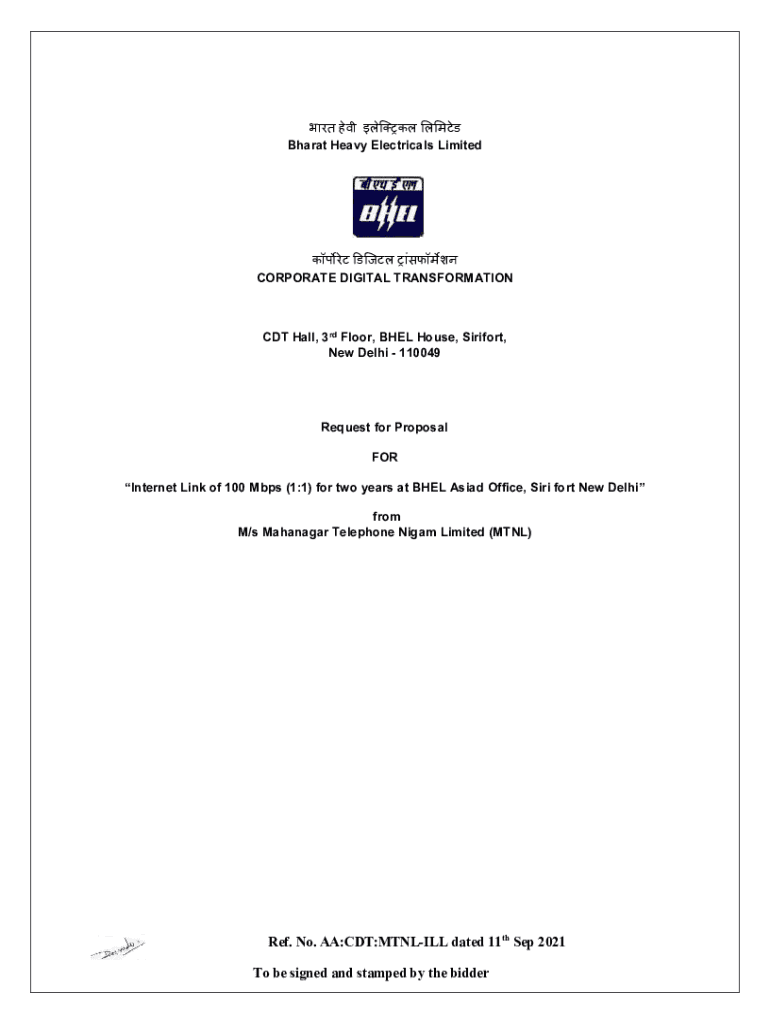 Bharat Heavy Electrical Limited CORPORATE DIGITAL TRANSFORMATION CDT Hall, 3rd Floor, BAEL House, Siri fort, New Delhi 110049Request for Proposal FOR Internet Link of 100 Mbps (1:1) for two years